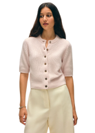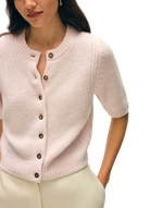 This ultra-light Cashmere Short Sleeve Cardigan was designed for upscale dressing with horn buttons and a slightly cropped length. Knit loosely with four ends of cashmere, this featherweight style feels like it is floating on your body.