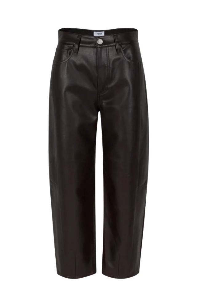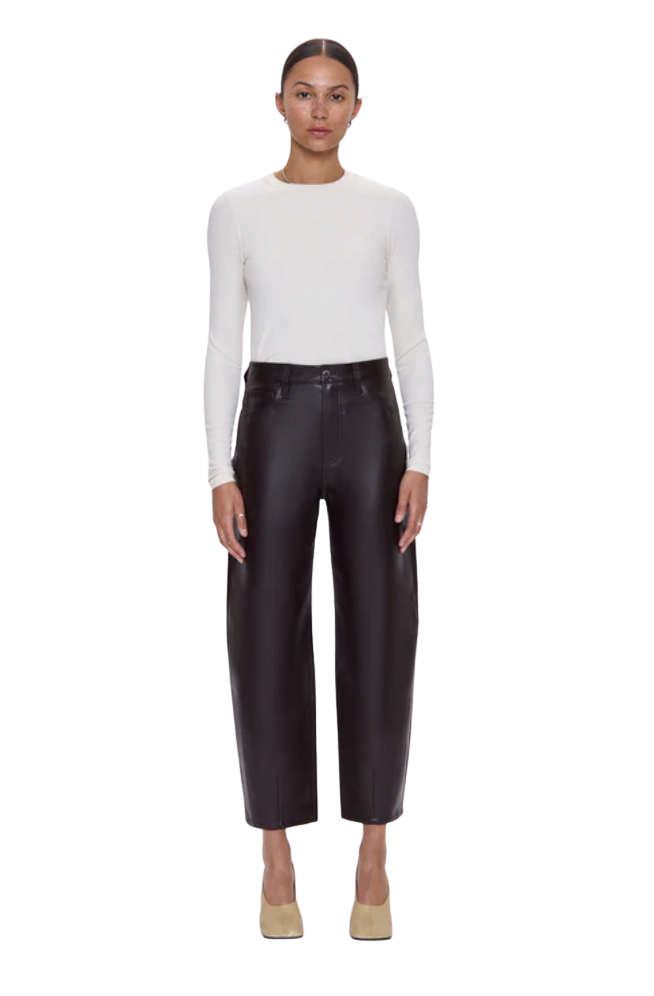 A modern barrel silhouette, Eli features a high rise, arched leg, and cropped 26" inseam for bold proportion. Crafted from buttery-soft alternative leather in French Roast, a rich espresso brown that delivers sleek sophistication and everyday versatility.