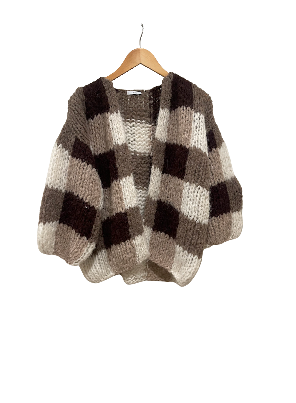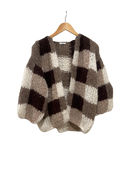 Fleecy alpaca checkered cardigan is soft and cozy. This unique check is a first time for Maiami. We love the casual nature of this brown check sweater.