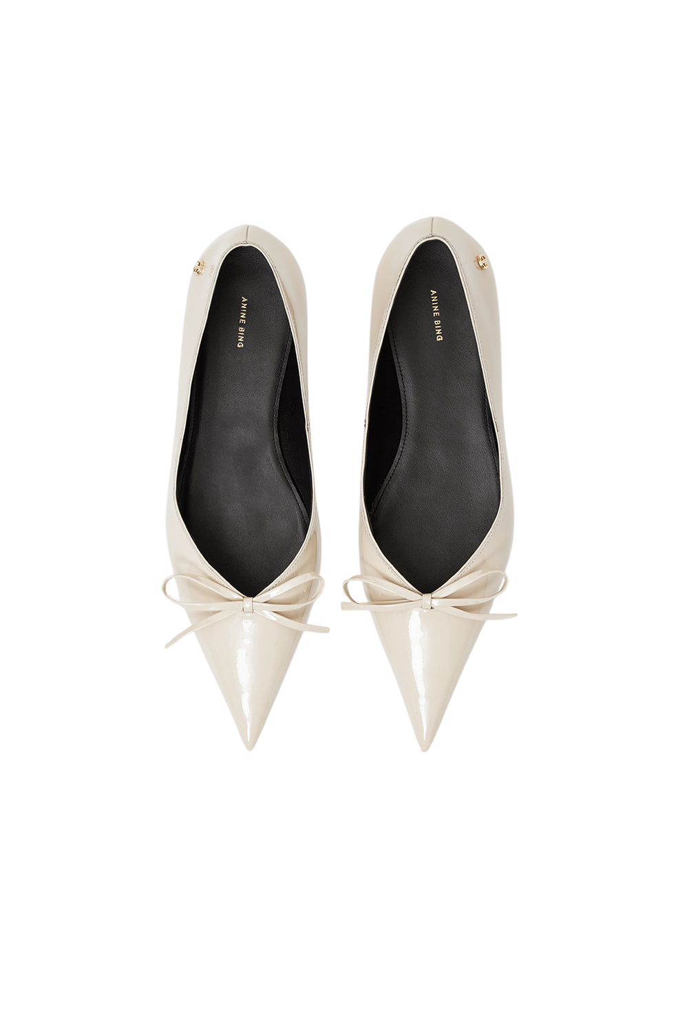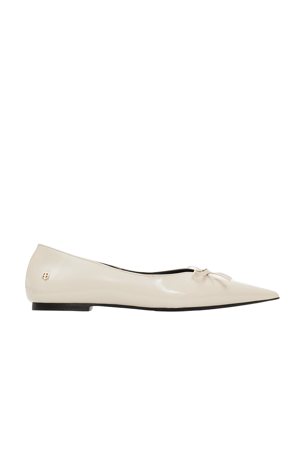 A pointed-toe ballet flat made of 100% patent leather in bone.