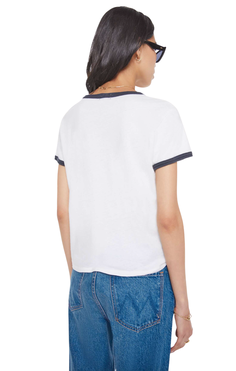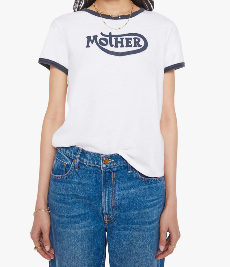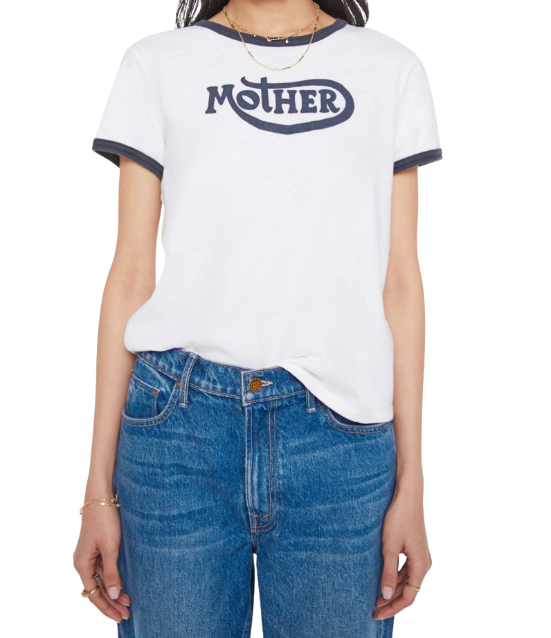 Born to ride. A crewneck tee with short sleeves and a slightly shrunken fit. Made from a recycled cotton blend in white with navy trim, the tee features MOTHER's name on the front.