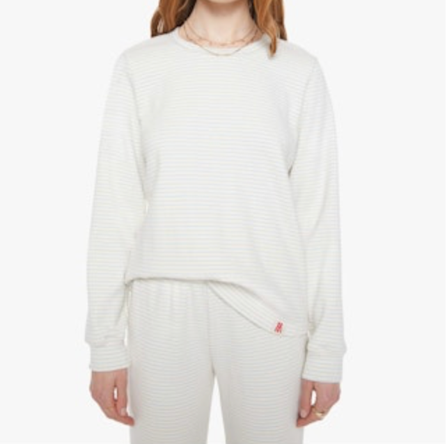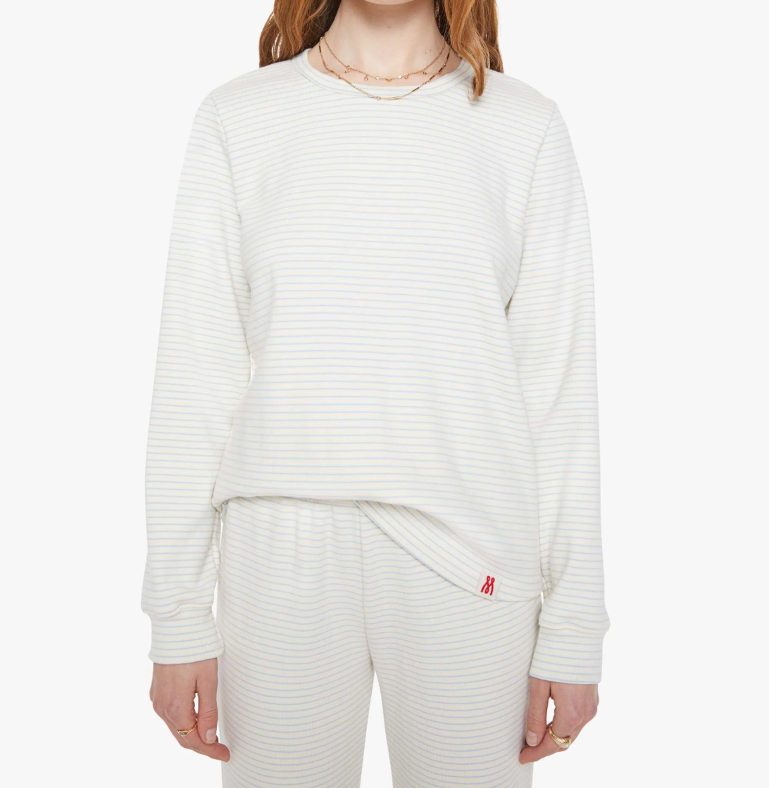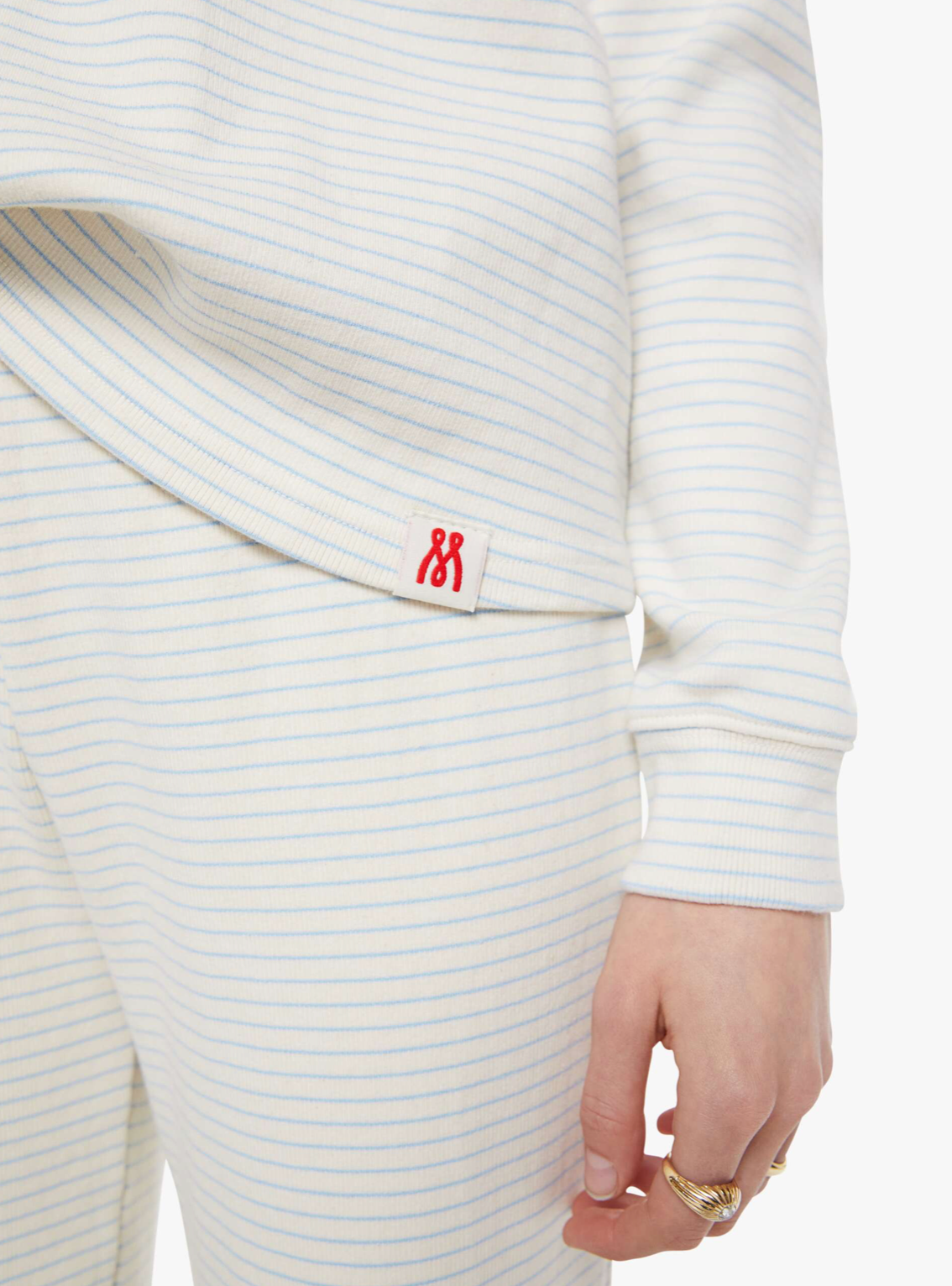Dusk till yawn. A crewneck tee with long sleeves and an oversized fit for a vintage look and feel. Made from a cotton blend, The L/S Boxy Goodie Goodie in Day To Night is designed in off-white with light blue horizontal stripes and a red M patch on the hem
